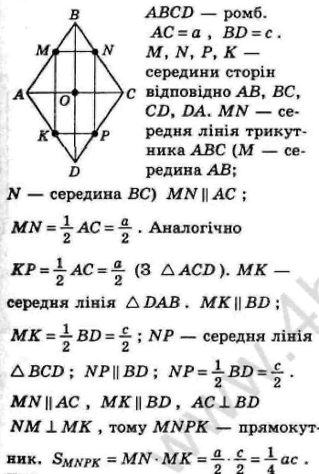 Діагоналі ромба дорівнюють а і с. Знайдіть площу чотирикутника,