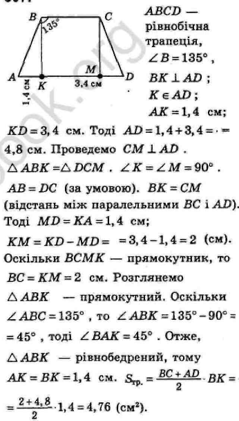 відрізки 1,4 см і 3,4 см. Обчисліть площу трапеції