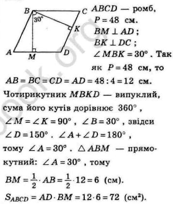 Знайдіть площу ромба, якщо його периметр 48 см, а кут між
