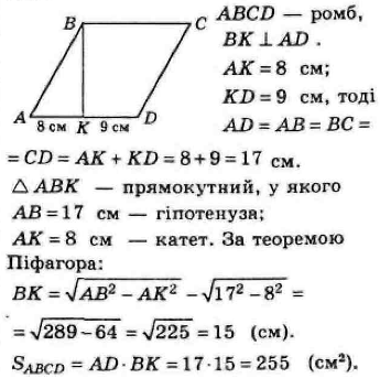 кута ромба, ділить сторону на відрізки 8 см і 9 см, починаючи