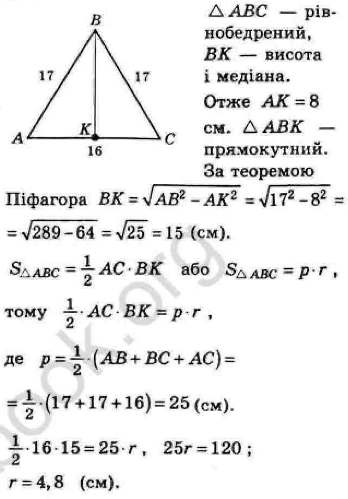 Знайдіть радіус кола, вписаного в рівнобедрений трикутник