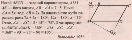 Кути паралелограма відносяться як 7 : 5 . Знайдіть кут між висотами паралело-