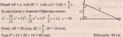 У трикутнику АВС /.С = 90°, зіпА = 0,8, АС = 12 см. Знайдіть периметр трикутника.