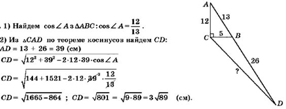 В треугольнике АВС известно, что / С = 90°, АН = = 13 см, АС =12 см. На продолжении гипотенузы АН за точку В отметили точку В так, что ВВ = 26 см. Найдите длину отрезка СВ.
