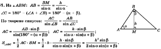 Отрезок ВМ — высота треугольника АВС, ВМ - h, Z А - а, Z АВС = ß. Найдите площадь треугольника АВС
