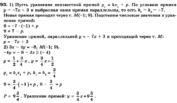 Составьте уравнение прямой, проходящей через точку М (-1; 9) и параллельной прямой: 1) у = -7х + 3; 2) Зх - 4у = -8.