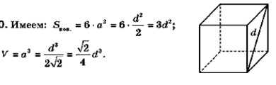 Найдите площадь поверхности и объем куба, если диагональ его грани равна d.