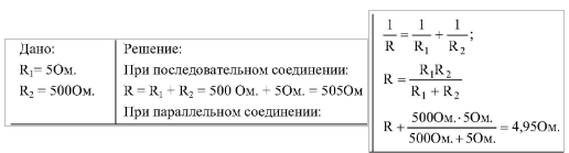 Также видно, что при параллельном их соединении суммарное их сопротивление меньше, чем у проводника с наименьшим сопротивлением.