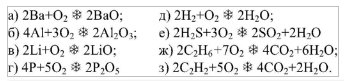 Пользуясь вышеприведенными указаниями (см. с. 56 учебника), составьте уравнения реакций горения следующих веществ: а) бария; б) алюминия; в) лития; г) фосфора; д) водорода; е) сероводорода H2S; ж) этана С2Н6; з) ацетилена С2Н2