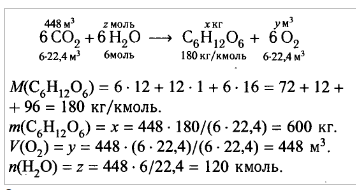 Найдите массу глюкозы и объем кислорода (н.у.), образующихся в процессе фотосинтеза, если в реакцию вступило 448 м3 углекислого газа (н.у.). Вычислите количество вещества воды, которое для этого потребовалось