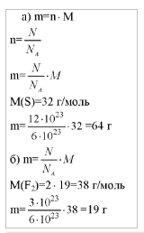 Рассчитайте массу: а) 12 • 1O23 атомов серы; б) 3 • 1O23 молекул фтора F2