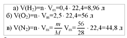 Рассчитайте, какой объем (н. у.) займут: а) 0,4 моль водорода; б) 2,5 моль кислорода; в) 56 г азота N2