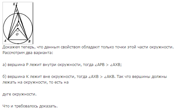 Докажите, что геометрическое место вершин углов с заданной градусной мерой, стороны которых проходят через две данные точки, а вершины лежат по одну сторону от прямой, соединяющей эти точки, есть дуга окружности с концами в этих точках. Пусть AB — от прямой AB, равны 1/2 ∠AOB, поэтому они равны между собой