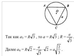 Сторона правильного вписанного в окружность треугольника равна а. Найдите сторону квадрата, вписанного в эту окружность. Дано: ΔАВС — правильный, вписанный в окружность а3 = а. Найдем а4.