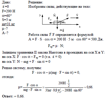 На груз, скользящий с трением по горизонтальной поверхности, действует сила 200 Н, направленная под углом 60° к горизонту. Чему равна работа силы при перемещении тела, равном 5 м, если движение тела прямолинейное и равномерное? Каков коэффициент трения груза о плоскость? Масса тела 31 кг.