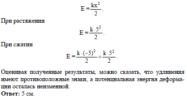 Имеются две пружины с одинаковой жесткостью. Одна из них сжата на 5 см, другая растянута на 5 см. Чем различаются удлинения этих пружин и их потенциальные энергии?