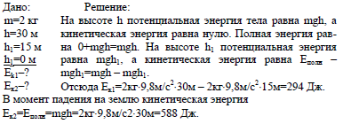 Тело массой 2 кг падает с высоты 30 м над землей. Вычислите кинетическую энергию тела в момент, когда оно находится на высоте 15 м над землей и в момент падения на землю.