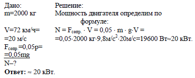 Автомобиль массой 2000 кг движется по горизонтальной дороге со скоростью 72 км/ч. Сила сопротивления движению составляет 0,05 его веса. Определите, какую мощность развивает при этом двигатель