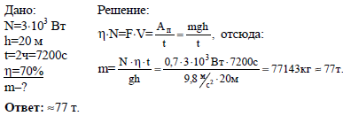Насос с мотором мощностью 3 кВт поднимает воду из колодца глубиной 20 м. Найдите массу поднятой воды, если насос работает 2 ч, а КПД его двигателя 70%
