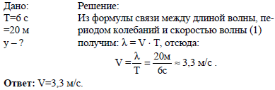 Рыбак заметил, что гребни волн проходят мимо кормы его лодки, стоящей на якоре, через каждые 6 с. Он измерил расстояние между ближайшими гребнями и нашел, что оно равно 20 м. Какова скорость волны?