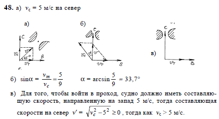 Штурман пытается провести судно в тумане через узкий проход между рифами. а) Он знает, что проход лежит к северо-востоку и что океанское течение сносит судно к востоку со скоростью 5 м/с. Винт сообщает судну скорость 5 м/с в направлении вперед. В каком направлении штурман должен вести судно, пользуясь своим компасом? б) Представьте себе, что проход между рифами идет в северном направлении, скорость течения равна 5 м/с, направлено оно на восток, а скорость, сообщаемая винтом судну, равна 9 м/с. Выполните построение и покажите, в каком направлении штурман должен вести судно по компасу. в) Представьте себе, что проход лежит к северу, а скорость течения равна 5 м/с, направлено оно на восток. Докажите, что судно можно провести через проход только в том случае, если судовой двигатель позволяет развить скорость больше 5 м/с.