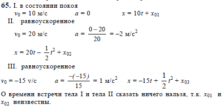На рисунке 20 приведены графики зависимости проекции скорости от времени для трех разных тел. Опишите характер движения каждого тела, отвечая на вопросы, поставленные в задаче 64. Можно ли по этим графикам определить, в какой момент времени второе тело догонит первое?