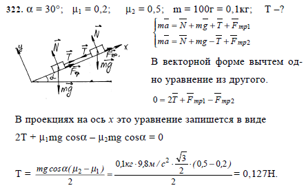 Два бруска массой 100 г каждый, связанные невесомой нитью, соскальзывают с наклонной плоскости с углом 30°. Коэффициент трения нижнего бруска о плоскость равен 0,2, верхнего — 0,5. Определите силу натяжения нити