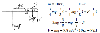 Однородная доска массой 10 кг подперта на расстоянии 1/4 ее длины. Какую силу, перпендикулярную доске, надо приложить к ее короткому концу, чтобы удержать доску в равновесии?