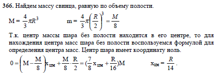 В свинцовом шаре сделана сферическая полость, поверхность которой касается шара и проходит через его центр. Масса сплошного шара равна М, радиус шара R. Найдите положение центра тяжести получившегося тела