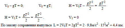 Снаряд, выпущенный под углом 45° к горизонту из пушки, установленной на плоской горизонтальной равнине, разрывается в верхней точке своей траектории на два осколка. Массы осколков равны. Первый осколок падает спустя 15 с после разрыва прямо под точкой разрыва. На каком расстоянии от пушки упадет второй осколок, если разрыв снаряда произошел через 15 с после выстрела? Сопротивлением воздуха пренебречь