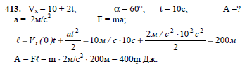 Тело движется вдоль оси ОХ, направленной горизонтально. Проекция скорости этого тела на эту ось изменяется со временем по закону vx=10 + 2t. Какую работу совершает сила, действующая на это тело, в течение 10 с, если она составляет угол 60° с направлением движения тела?