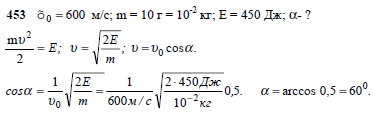 Начальная скорость пули 600 м/с, ее масса 10 г. Под каким углом к горизонту она вылетела из дула ружья, если ее кинетическая энергия в высшей точке траектории равна 450 Дж?