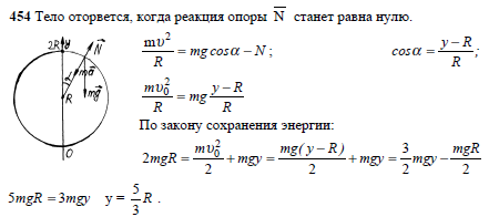 Шар радиусом R покоится на поверхности земли. С верхней точки шара скользит из состояния покоя тело, размеры которого много меньше размеров шара. На какой высоте над поверхностью земли тело отделится от шара?
