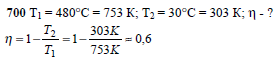 Каков КПД идеальной паровой турбины, если пар поступает в турбину с температурой 480 °С, а оставляет ее при температуре 30 °С?