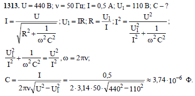 Конденсатор и электрическая лампочка включены последовательно в цепь переменного тока напряжением 440 В и частотой 50 Гц. Какую емкость должен иметь конденсатор для того, чтобы через лампочку протекал ток 0,5 А и падение напряжения на ней было равным 110 В?