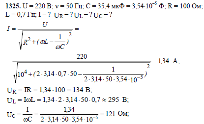 В цепь переменного тока напряжением 220 В и частотой 50 Гц включены последовательно конденсатор емкостью 35,4 мкФ, проводник сопротивлением 100 Ом и катушка индуктивностью 0,7 Гн. Найдите ток в цепи и падение напряжения на конденсаторе, проводнике и катушке