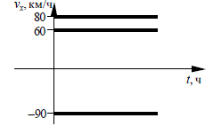 Постройте графики зависимости проекций векторов скорости от времени для трех автомобилей, движущихся прямолинейно и равномерно, если два из них едут в одном направлении, а третий — навстречу им. Скорость первого автомобиля равна 60 км/ч, второго — 80 км/ч, а третьего — 90 км/ч