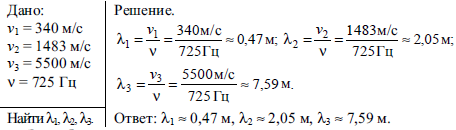 Определите длину звуковой волны частотой 725 Гц в воздухе, в воде и в стекле