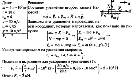 Автомобиль «Жигули» массой 1 т, трогаясь с места, достигает скорости 30 м/с через 20 с. Найти силу тяги, если коэффициент сопротивления равен 0,05