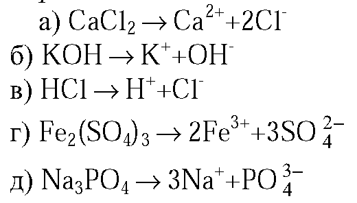 Напишите уравнения электролитической диссоциации: а) хлорида кальция; б) гидроксида калия; в) соляной кислоты; г) сульфата железа(iii); д) фосфата натрия