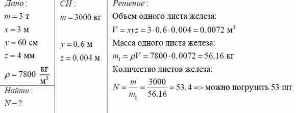Грузоподъёмность лифта 3 т. Сколько листов железа можно погрузить в лифт, если длина каждого листа 3 м, ширина 60 см и толщина 4 мм?
