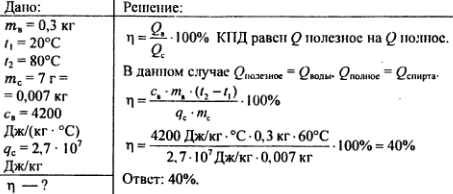 Воду массой 0,3 кг нагрели на спиртовке от 20 °С до 80 °С и сожгли при этом 7 г спирта. Определите КПД спиртовки