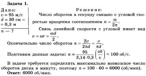 Линейная скорость периферийных точек шлифовального камня не должна превышать 95 м/с. Определите наибольшее допустимое число оборотов в минуту для диска диаметром 30 см.