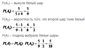 В урне 5 белых и 4 черных шара. Из нее вынимают подряд 2 шара. Найти вероятность того, что оба шара белые.
