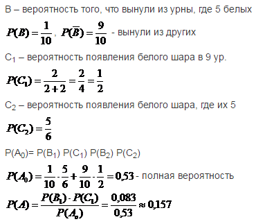 Имеется 10 урн. В 9 урнах по 2 черных и 2 белых шара. В 1 урне 5 белых и 1 черный. Из урны, взятой наугад, вынули шар.