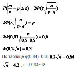 Сколько раз надо бросить монету, чтобы с вероятностью 0,6 можно было ожидать, что отклонение относительной частоты появления герба от вероятности 0,5 окажется по абсолютной величине не более 0,01