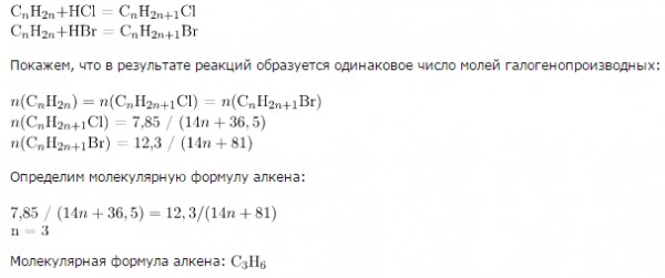При взаимодействии одного и того же количества алкена с различными галогеноводородами образуется соответственно 7,85 г хлорпроизводного или 12,3 г бромпроизводного. Определите молекулярную формулу алкена