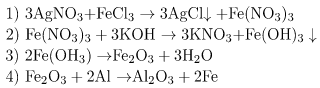 Осадок, полученный при взаимодействии растворов хлорида железа (III) и нитрата серебра, отфильтровали. Фильтрат обработали раствором едкого кали. Выпавший осадок бурого цвета отделили и прокалили. Полученное вещество при нагревании реагирует с алюминием с выделением тепла и света. Напишите уравнения описанных реакций