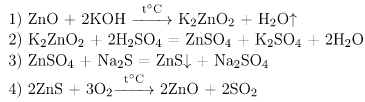Оксид цинка спла­ви­ли с твёрдым гид­рок­си­дом калия. По­лу­чен­ное в ре­зуль­та­те твёрдое ве­ще­ство рас­тво­ри­ли в не­об­хо­ди­мом ко­ли­че­стве рас­тво­ра сер­ной кислоты. В об­ра­зо­вав­ший­ся рас­твор до­ба­ви­ли суль­фид натрия, в ре­зуль­та­те чего об­ра­зо­вал­ся белый осадок. Оса­док отделили, высушили, а затем со­жгли в из­быт­ке кислорода. На­пи­ши­те урав­не­ния четырёх опи­сан­ных реакций.