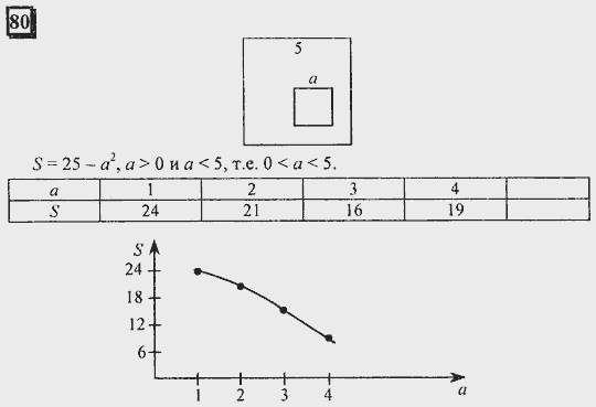 Из квадрата со стороной 5 см вырезали квадрат со стороной а см. Площадь оставшейся части квадрата - S см2. Запиши формулу зависимости S от а. Какие значения может принимать а? Построй график этой зависимости для всех допустимых значений а.